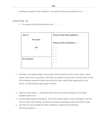 243endlessly, except for their watchers. The names of the three watchers are: %u2026 %u2026 %u2026CHAPTER 101. The names of the three watchers are: ... %u2026 %u2026(Jeu 5)His name:%u2026JeuThese are the three watchers: ....These are the emanations: ....%u2026 %u2026%u2026 %u2026%u2026 %u2026%u2026 %u2026%u2026 %u2026%u2026 %u2026His character:2. And there are twelve heads in each place of the treasuries of his ranks, that is, these names which are in the places. And there are twelve in each rank, and this name is that of the twelve, except for those that will be in them, when they sing praises to my Father, so that he gives light-power to them. 3. These are they which ... emanated forth from him when the power of my Father radiated within him. 4. He emanated twelve emanations. There are twelve heads in each emanation, and this name is that of the twelve, and there are twelve according to each one of the ranks. 5. And they are one outside the other endlessly, except for the watchers.The three watchers %u2026 %u2026 %u2026