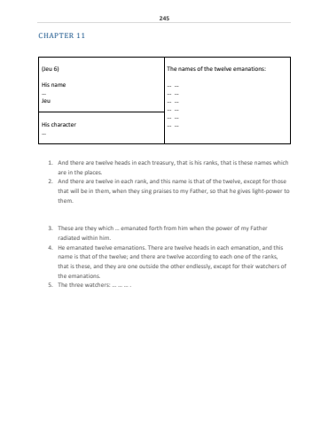 245CHAPTER 11(Jeu 6)His name%u2026JeuThe names of the twelve emanations:%u2026 %u2026%u2026 %u2026%u2026 %u2026%u2026 %u2026%u2026 %u2026His character %u2026 %u2026%u2026 1. And there are twelve heads in each treasury, that is his ranks, that is these names which are in the places. 2. And there are twelve in each rank, and this name is that of the twelve, except for thosethat will be in them, when they sing praises to my Father, so that he gives light-power to them.3. These are they which %u2026 emanated forth from him when the power of my Father radiated within him. 4. He emanated twelve emanations. There are twelve heads in each emanation, and thisname is that of the twelve; and there are twelve according to each one of the ranks, that is these, and they are one outside the other endlessly, except for their watchers of the emanations. 5. The three watchers: %u2026 %u2026 %u2026 .