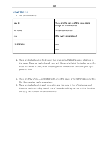 249CHAPTER 131. The three watchers: ... %u2026 %u2026(Jeu 8)His name%u2026JeuThese are the names of the emanations,except for their watchers.The three watchers: %u2026 %u2026 %u2026(The twelve emanations)%u2026 %u2026%u2026 %u2026%u2026 %u2026%u2026 %u2026%u2026 %u2026%u2026 %u2026His character2. There are twelve heads in his treasury that is his ranks, that is the names which are in the places. There are twelve in each rank, and this name is that of the twelve, except for those that will be in them, when they sing praises to my Father, so that he gives lightpower to them.3. These are they which . . . emanated forth, when the power of my Father radiated within him. He emanated twelve emanations.4. There are twelve heads in each emanation, and this name is that of the twelve; and there are twelve according to each one of the ranks and they are one outside the other endlessly. The name of the three watchers: %u2026 %u2026 %u2026