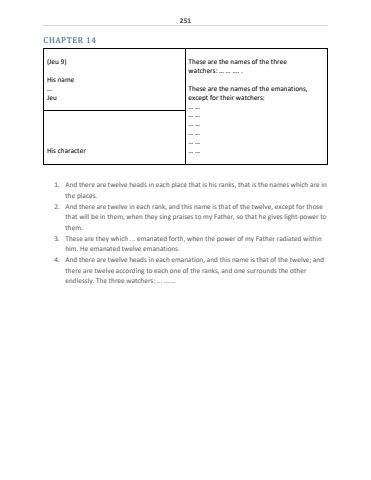 251CHAPTER 14(Jeu 9)His name%u2026JeuThese are the names of the threewatchers: %u2026 %u2026 %u2026. .These are the names of the emanations,except for their watchers:%u2026 %u2026%u2026 %u2026%u2026 %u2026%u2026 %u2026%u2026 %u2026His character %u2026 %u20261. And there are twelve heads in each place that is his ranks, that is the names which are in the places. 2. And there are twelve in each rank, and this name is that of the twelve, except for those that will be in them, when they sing praises to my Father, so that he gives light-power to them.3. These are they which ... emanated forth, when the power of my Father radiated within him. He emanated twelve emanations.4. And there are twelve heads in each emanation, and this name is that of the twelve; and there are twelve according to each one of the ranks, and one surrounds the other endlessly. The three watchers: ... %u2026 %u2026