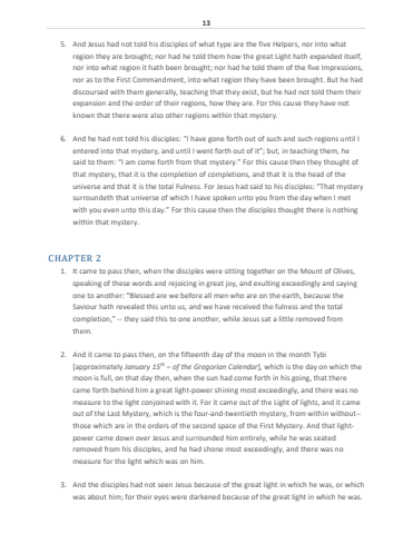 135. And Jesus had not told his disciples of what type are the five Helpers, nor into what region they are brought; nor had he told them how the great Light hath expanded itself, nor into what region it hath been brought; nor had he told them of the five Impressions, nor as to the First Commandment, into what region they have been brought. But he had discoursed with them generally, teaching that they exist, but he had not told them their expansion and the order of their regions, how they are. For this cause they have not known that there were also other regions within that mystery.6. And he had not told his disciples: %u201cI have gone forth out of such and such regions until I entered into that mystery, and until I went forth out of it%u201d; but, in teaching them, he said to them: %u201cI am come forth from that mystery.%u201d For this cause then they thought of that mystery, that it is the completion of completions, and that it is the head of the universe and that it is the total Fulness. For Jesus had said to his disciples: %u201cThat mystery surroundeth that universe of which I have spoken unto you from the day when I met with you even unto this day.%u201d For this cause then the disciples thought there is nothing within that mystery.CHAPTER 21. It came to pass then, when the disciples were sitting together on the Mount of Olives, speaking of these words and rejoicing in great joy, and exulting exceedingly and saying one to another: %u201cBlessed are we before all men who are on the earth, because the Saviour hath revealed this unto us, and we have received the fulness and the total completion,%u201d -- they said this to one another, while Jesus sat a little removed from them.2. And it came to pass then, on the fifteenth day of the moon in the month Tybi[approximately January 15th %u2013 of the Gregorian Calendar], which is the day on which the moon is full, on that day then, when the sun had come forth in his going, that there came forth behind him a great light-power shining most exceedingly, and there was no measure to the light conjoined with it. For it came out of the Light of lights, and it came out of the Last Mystery, which is the four-and-twentieth mystery, from within without--those which are in the orders of the second space of the First Mystery. And that lightpower came down over Jesus and surrounded him entirely, while he was seated removed from his disciples, and he had shone most exceedingly, and there was no measure for the light which was on him.3. And the disciples had not seen Jesus because of the great light in which he was, or which was about him; for their eyes were darkened because of the great light in which he was.