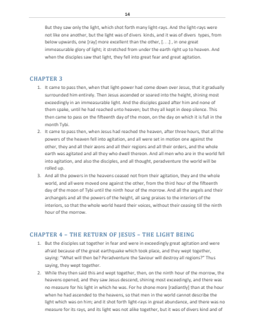 14But they saw only the light, which shot forth many light-rays. And the light-rays were not like one another, but the light was of divers kinds, and it was of divers types, from below upwards, one [ray] more excellent than the other, [. . .] , in one great immeasurable glory of light; it stretched from under the earth right up to heaven. And when the disciples saw that light, they fell into great fear and great agitation.CHAPTER 31. It came to pass then, when that light-power had come down over Jesus, that it gradually surrounded him entirely. Then Jesus ascended or soared into the height, shining most exceedingly in an immeasurable light. And the disciples gazed after him and none of them spake, until he had reached unto heaven; but they all kept in deep silence. This then came to pass on the fifteenth day of the moon, on the day on which it is full in the month Tybi.2. It came to pass then, when Jesus had reached the heaven, after three hours, that all the powers of the heaven fell into agitation, and all were set in motion one against the other, they and all their %u00e6ons and all their regions and all their orders, and the whole earth was agitated and all they who dwell thereon. And all men who are in the world fell into agitation, and also the disciples, and all thought, peradventure the world will be rolled up.3. And all the powers in the heavens ceased not from their agitation, they and the whole world, and all were moved one against the other, from the third hour of the fifteenth day of the moon of Tybi until the ninth hour of the morrow. And all the angels and their archangels and all the powers of the height, all sang praises to the interiors of the interiors, so that the whole world heard their voices, without their ceasing till the ninth hour of the morrow.CHAPTER 4 %u2013 THE RETURN OF JESUS %u2013 THE LIGHT BEING1. But the disciples sat together in fear and were in exceedingly great agitation and were afraid because of the great earthquake which took place, and they wept together, saying: %u201cWhat will then be? Peradventure the Saviour will destroy all regions?%u201d Thus saying, they wept together.2. While they then said this and wept together, then, on the ninth hour of the morrow, the heavens opened, and they saw Jesus descend, shining most exceedingly, and there was no measure for his light in which he was. For he shone more [radiantly] than at the hour when he had ascended to the heavens, so that men in the world cannot describe the light which was on him; and it shot forth light-rays in great abundance, and there was no measure for its rays, and its light was not alike together, but it was of divers kind and of