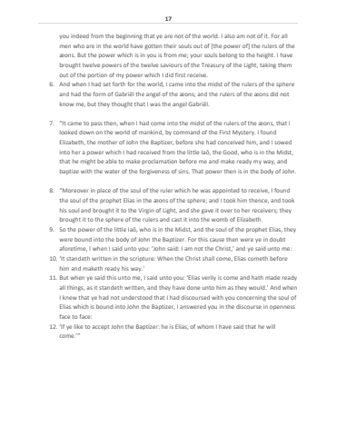 17you indeed from the beginning that ye are not of the world. I also am not of it. For all men who are in the world have gotten their souls out of [the power of] the rulers of the %u00e6ons. But the power which is in you is from me; your souls belong to the height. I have brought twelve powers of the twelve saviours of the Treasury of the Light, taking them out of the portion of my power which I did first receive. 6. And when I had set forth for the world, I came into the midst of the rulers of the sphere and had the form of Gabri%u0113l the angel of the %u00e6ons; and the rulers of the %u00e6ons did not know me, but they thought that I was the angel Gabri%u0113l.7. %u201cIt came to pass then, when I had come into the midst of the rulers of the %u00e6ons, that I looked down on the world of mankind, by command of the First Mystery. I found Elizabeth, the mother of John the Baptizer, before she had conceived him, and I sowed into her a power which I had received from the little Ia%u014d, the Good, who is in the Midst, that he might be able to make proclamation before me and make ready my way, and baptize with the water of the forgiveness of sins. That power then is in the body of John.8. %u201cMoreover in place of the soul of the ruler which he was appointed to receive, I found the soul of the prophet Elias in the %u00e6ons of the sphere; and I took him thence, and took his soul and brought it to the Virgin of Light, and she gave it over to her receivers; they brought it to the sphere of the rulers and cast it into the womb of Elizabeth. 9. So the power of the little Ia%u014d, who is in the Midst, and the soul of the prophet Elias, they were bound into the body of John the Baptizer. For this cause then were ye in doubt aforetime, I when I said unto you: %u2018John said: I am not the Christ,%u2019 and ye said unto me: 10. %u2018It standeth written in the scripture: When the Christ shall come, Elias cometh before him and maketh ready his way.%u2019 11. But when ye said this unto me, I said unto you: %u2018Elias verily is come and hath made ready all things, as it standeth written, and they have done unto him as they would.%u2019 And when I knew that ye had not understood that I had discoursed with you concerning the soul of Elias which is bound into John the Baptizer, I answered you in the discourse in openness face to face: 12. %u2018If ye like to accept John the Baptizer: he is Elias, of whom I have said that he will come.%u2019%u201d