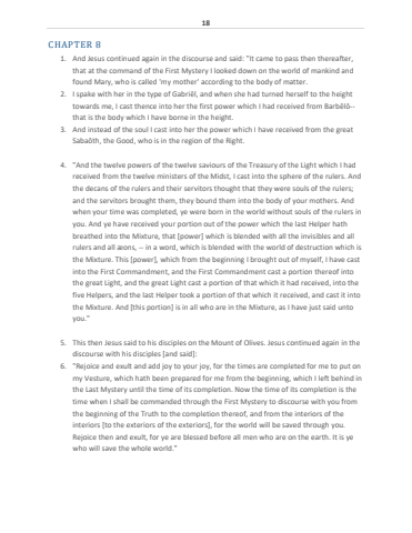 18CHAPTER 81. And Jesus continued again in the discourse and said: \that at the command of the First Mystery I looked down on the world of mankind and found Mary, who is called 'my mother' according to the body of matter. 2. I spake with her in the type of Gabri%u0113l, and when she had turned herself to the height towards me, I cast thence into her the first power which I had received from Barb%u0113l%u014d--that is the body which I have borne in the height. 3. And instead of the soul I cast into her the power which I have received from the great Saba%u014dth, the Good, who is in the region of the Right.4. \received from the twelve ministers of the Midst, I cast into the sphere of the rulers. And the decans of the rulers and their servitors thought that they were souls of the rulers; and the servitors brought them, they bound them into the body of your mothers. And when your time was completed, ye were born in the world without souls of the rulers in you. And ye have received your portion out of the power which the last Helper hath breathed into the Mixture, that [power] which is blended with all the invisibles and all rulers and all %u00e6ons, -- in a word, which is blended with the world of destruction which is the Mixture. This [power], which from the beginning I brought out of myself, I have cast into the First Commandment, and the First Commandment cast a portion thereof into the great Light, and the great Light cast a portion of that which it had received, into the five Helpers, and the last Helper took a portion of that which it received, and cast it into the Mixture. And [this portion] is in all who are in the Mixture, as I have just said unto you.\5. This then Jesus said to his disciples on the Mount of Olives. Jesus continued again in the discourse with his disciples [and said]: 6. \my Vesture, which hath been prepared for me from the beginning, which I left behind in the Last Mystery until the time of its completion. Now the time of its completion is the time when I shall be commanded through the First Mystery to discourse with you from the beginning of the Truth to the completion thereof, and from the interiors of the interiors [to the exteriors of the exteriors], for the world will be saved through you. Rejoice then and exult, for ye are blessed before all men who are on the earth. It is ye who will save the whole world.\