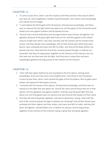 21CHAPTER 111. \was sent me, that straightway I clothed myself therewith, and I shone most exceedingly and soared into the height.2. \was no measure for the light which was about me, and the gates of the firmament were shaken one over against another and all opened at once.3. \agitation because of the great light which was on me. And they gazed at the radiant vesture of light with which I was clad, and they saw the mystery which contains their names, and they feared most exceedingly. And all their bonds with which they were bound, were unloosed and every one left his order, and they all fell down before me, adored and said: 'How hath the lord of the universe passed through us without our knowing?' And they all sang praises together to the interiors of the interiors; but me they saw not, but they saw only the light. And they were in great fear and were exceedingly agitated and sang praises to the interiors of the interiors.CHAPTER 121. \exceedingly, forty-and-nine-times more brightly than I had shone in the firmament. It came to pass then, when I had reached the gate of the first sphere, that its gates were shaken and opened of themselves at once.2. \measure to the light that was about me. And all the rulers and all those who are in that sphere, fell into agitation one against another. And they saw the great light that was about me, and they gazed upon my vesture and saw thereon the mystery of their name. 3. And they fell into still greater agitation, and were in great fear, saying: 'How hath the lord of the universe passed through us without our knowing?' And all their bonds were unloosed and their regions and their orders; and every one left his order, and they fell down all together, adored before me, or before my vesture, and all sang praises together to the interiors of the interiors, being in great fear and great agitation.