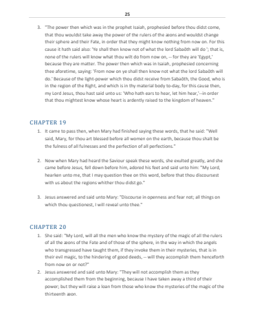 253. \that thou wouldst take away the power of the rulers of the %u00e6ons and wouldst change their sphere and their Fate, in order that they might know nothing from now on. For this cause it hath said also: 'Ye shall then know not of what the lord Saba%u014dth will do '; that is, none of the rulers will know what thou wilt do from now on, -- for they are 'Egypt,' because they are matter. The power then which was in Isaiah, prophesied concerning thee aforetime, saying: 'From now on ye shall then know not what the lord Saba%u014dth will do.' Because of the light-power which thou didst receive from Saba%u014dth, the Good, who is in the region of the Right, and which is in thy material body to-day, for this cause then, my Lord Jesus, thou hast said unto us: 'Who hath ears to hear, let him hear,'--in order that thou mightest know whose heart is ardently raised to the kingdom of heaven.\CHAPTER 191. It came to pass then, when Mary had finished saying these words, that he said: \said, Mary, for thou art blessed before all women on the earth, because thou shalt be the fulness of all fulnesses and the perfection of all perfections.\2. Now when Mary had heard the Saviour speak these words, she exulted greatly, and she came before Jesus, fell down before him, adored his feet and said unto him: \hearken unto me, that I may question thee on this word, before that thou discoursest with us about the regions whither thou didst go.\3. Jesus answered and said unto Mary: \which thou questionest, I will reveal unto thee.\CHAPTER 201. She said: \of all the %u00e6ons of the Fate and of those of the sphere, in the way in which the angels who transgressed have taught them, if they invoke them in their mysteries, that is in their evil magic, to the hindering of good deeds, -- will they accomplish them henceforth from now on or not?\2. Jesus answered and said unto Mary: \accomplished them from the beginning, because I have taken away a third of their power; but they will raise a loan from those who know the mysteries of the magic of the thirteenth %u00e6on.