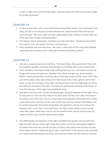 28raised on high, they and the whole power, and that those who shall not be saved, might be quickly destroyed.\CHAPTER 241. It came to pass then, when Jesus had finished saying these words unto his disciples, that Mary, the fair in her discourse and the blessed one, came forward, fell at the feet of Jesus and said: \if oft I give thee trouble questioning thee.\2. The Saviour, full of compassion, answered and said unto Mary: \thou willest, and I will reveal it to thee in all openness.\3. Mary answered and said unto Jesus: \themselves here outside, and in what type will they be quickly purified?\CHAPTER 251. And Jesus answered and said unto Mary: \thy excellent question, and thou throwest light on all things with surety and precision.2. Now, therefore, from now on will I hide nothing from you, but I will reveal unto you all things with surety and openness. Hearken then, Mary, and give ear, all ye disciples: Before I made proclamation to all the rulers of the %u00e6ons and to all the rulers of the Fate and of the sphere, they were all bound in their bonds and in their spheres and in their seals, as Yew, the Overseer of the Light, had bound them from the beginning; and every one of them remained in his order, and every one journeyed according to his course, as Yew, the Overseer of the Light, had established them. 3. And when the time of the number of Melchisedec, the great Receiver of the Light, came, he was wont to come into the midst of the %u00e6ons and of all the rulers who are bound in the sphere and in the Fate, and he carried away the purification of the light from all the rulers of the %u00e6ons and from all the rulers of the Fate and from those of the sphere--for he carried away then that which brings them into agitation--and he set in motion the hastener who is over them, and made them turn their circles swiftly, and he carried away their power which was in them and the breath of their mouth and the tears [lit. waters] of their eyes and the sweat of their bodies.4. And Melchisedec, the Receiver of the Light; purifieth those powers and carrieth their light into the Treasury of the Light, while the servitors of all the rulers gather together all matter from them all; and the servitors of all the rulers of the Fate and the servitors of the sphere which is below the %u00e6ons, take it and fashion it into souls of men and cattle and reptiles and wild-beasts and birds, and send them down into the world of mankind.