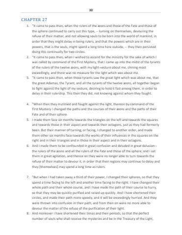 30CHAPTER 271. \the sphere continued to carry out this type, -- turning on themselves, devouring the refuse of their matter, and not allowing souls to be born into the world of mankind, in order that they might delay in being rulers, and that the powers which are in their powers, that is the souls, might spend a long time here outside, -- they then persisted doing this continually for two circles.2. \was called by command of the First Mystery, that I came up into the midst of the tyrants of the rulers of the twelve %u00e6ons, with my light-vesture about me, shining most exceedingly, and there was no measure for the light which was about me.3. \the great Adamas, the Tyrant, and all the tyrants of the twelve %u00e6ons, all together began to fight against the light of my vesture, desiring to hold it fast among them, in order to delay in their rulership. This then they did, not knowing against whom they fought.4. \First Mystery I changed the paths and the courses of their %u00e6ons and the paths of their Fate and of their sphere. 5. I made them face six months towards the triangles on the left and towards the squares and towards those in their aspect and towards their octagons, just as they had formerly been. But their manner of turning, or facing, I changed to another order, and made them other six months face towards the works of their influences in the squares on the right and in their triangles and in those in their aspect and in their octagons. 6. And I made them to be confounded in great confusion and deluded in great delusion--the rulers of the %u00e6ons and all the rulers of the Fate and those of the sphere; and I set them in great agitation, and thence on they were no longer able to turn towards the refuse of their matter to devour it, in order that their regions may continue to delay and they [themselves] may spend a long time as rulers.7. \spend a time facing to the left and another time facing to the right. I have changed their whole path and their whole course, and I have made the path of their course to hurry, so that they may be quickly purified and raised up quickly. And I have shortened their circles, and made their path more speedy, and it will be exceedingly hurried. And they were thrown into confusion in their path, and from then on were no more able to devour the matter of the refuse of the purification of their light. 8. And moreover I have shortened their times and their periods, so that the perfect number of souls who shall receive the mysteries and be in the Treasury of the Light,