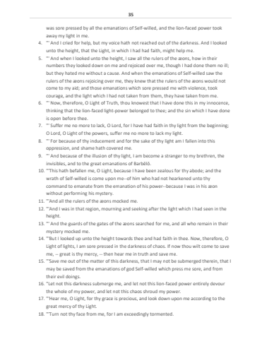 35was sore pressed by all the emanations of Self-willed, and the lion-faced power took away my light in me.4. \ And I cried for help, but my voice hath not reached out of the darkness. And I looked unto the height, that the Light, in which I had had faith, might help me.5. \ And when I looked unto the height, I saw all the rulers of the %u00e6ons, how in their numbers they looked down on me and rejoiced over me, though I had done them no ill; but they hated me without a cause. And when the emanations of Self-willed saw the rulers of the %u00e6ons rejoicing over me, they knew that the rulers of the %u00e6ons would not come to my aid; and those emanations which sore pressed me with violence, took courage, and the light which I had not taken from them, they have taken from me.6. \ Now, therefore, O Light of Truth, thou knowest that I have done this in my innocence, thinking that the lion-faced light-power belonged to thee; and the sin which I have done is open before thee.7. \ Suffer me no more to lack, O Lord, for I have had faith in thy light from the beginning; O Lord, O Light of the powers, suffer me no more to lack my light.8. \ For because of thy inducement and for the sake of thy light am I fallen into this oppression, and shame hath covered me.9. \ And because of the illusion of thy light, I am become a stranger to my brethren, the invisibles, and to the great emanations of Barb%u0113l%u014d.10. \wrath of Self-willed is come upon me--of him who had not hearkened unto thy command to emanate from the emanation of his power--because I was in his %u00e6on without performing his mystery.11. \12. \height.13. \mystery mocked me.14. \Light of lights, I am sore pressed in the darkness of chaos. If now thou wilt come to save me, -- great is thy mercy, -- then hear me in truth and save me.15. \may be saved from the emanations of god Self-willed which press me sore, and from their evil doings.16. \the whole of my power, and let not this chaos shroud my power.17. \great mercy of thy Light.18. \