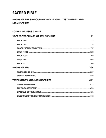 SACRED BIBLEBOOKS OF THE SAVIOUR AND ADDITIONAL TESTAMENTS AND MANUSCRIPTSSOPHIA OF JESUS CHRIST ...................................................................1SACRED TEACHINGS OF JESUS CHRIST ..............................................11BOOK ONE .................................................................................................................. 12BOOK TWO ................................................................................................................. 76CONCLUSION OF BOOK TWO......................................................................................137BOOK THREE ..............................................................................................................138BOOK FOUR ...............................................................................................................169BOOK FIVE .................................................................................................................187BOOK SIX ...................................................................................................................199BOOKS OF JEU................................................................................206FIRST BOOK OF JEU ....................................................................................................207SECOND BOOK OF JEU................................................................................................329TESTAMENTS AND MANUSCRIPTS ..................................................411GOSPEL OF THOMAS ..................................................................................................412THE BOOK OF THOMAS ..............................................................................................424DIALOGUE OF THE SAVIOUR.......................................................................................431DISCOURSE OF THE EIGHTH AND NINTH .....................................................................442