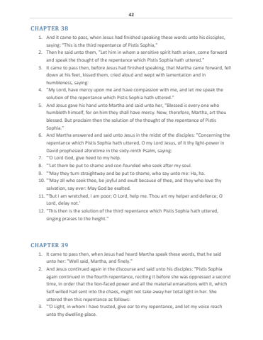 42CHAPTER 381. And it came to pass, when Jesus had finished speaking these words unto his disciples, saying: \2. Then he said unto them, \and speak the thought of the repentance which Pistis Sophia hath uttered.\3. It came to pass then, before Jesus had finished speaking, that Martha came forward, fell down at his feet, kissed them, cried aloud and wept with lamentation and in humbleness, saying: 4. \solution of the repentance which Pistis Sophia hath uttered.\5. And Jesus gave his hand unto Martha and said unto her, \humbleth himself, for on him they shall have mercy. Now, therefore, Martha, art thou blessed. But proclaim then the solution of the thought of the repentance of Pistis Sophia.\6. And Martha answered and said unto Jesus in the midst of the disciples: \repentance which Pistis Sophia hath uttered, O my Lord Jesus, of it thy light-power in David prophesied aforetime in the sixty-ninth Psalm, saying:7. \8. \9. \10. \salvation, say ever: May God be exalted.11. \Lord, delay not.'12. \singing praises to the height.\CHAPTER 391. It came to pass then, when Jesus had heard Martha speak these words, that he said unto her: \2. And Jesus continued again in the discourse and said unto his disciples: \again continued in the fourth repentance, reciting it before she was oppressed a second time, in order that the lion-faced power and all the material emanations with it, which Self-willed had sent into the chaos, might not take away her total light in her. She uttered then this repentance as follows:3. %unto thy dwelling-place.