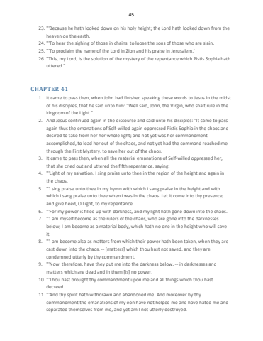 4523. \heaven on the earth,24. \25. \26. %uttered.\CHAPTER 411. It came to pass then, when John had finished speaking these words to Jesus in the midst of his disciples, that he said unto him: \kingdom of the Light.\2. And Jesus continued again in the discourse and said unto his disciples: \again thus the emanations of Self-willed again oppressed Pistis Sophia in the chaos anddesired to take from her her whole light; and not yet was her commandment accomplished, to lead her out of the chaos, and not yet had the command reached me through the First Mystery, to save her out of the chaos. 3. It came to pass then, when all the material emanations of Self-willed oppressed her, that she cried out and uttered the fifth repentance, saying:4. \the chaos.5. \which I sang praise unto thee when I was in the chaos. Let it come into thy presence, and give heed, O Light, to my repentance.6. \7. \below; I am become as a material body, which hath no one in the height who will save it.8. \cast down into the chaos, -- [matters] which thou hast not saved, and they are condemned utterly by thy commandment.9. \matters which are dead and in them [is] no power.10. \decreed.11. \commandment the emanations of my eon have not helped me and have hated me and separated themselves from me, and yet am I not utterly destroyed.