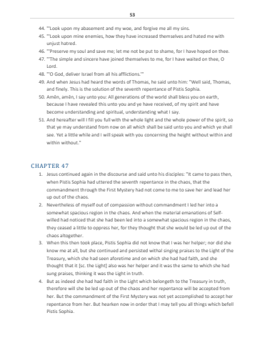 5344. \45. %unjust hatred.46. \47. \Lord.48. \49. And when Jesus had heard the words of Thomas, he said unto him: \and finely. This is the solution of the seventh repentance of Pistis Sophia. 50. Am%u0113n, am%u0113n, I say unto you: All generations of the world shall bless you on earth, because I have revealed this unto you and ye have received, of my spirit and have become understanding and spiritual, understanding what I say. 51. And hereafter will I fill you full with the whole light and the whole power of the spirit, so that ye may understand from now on all which shall be said unto you and which ye shall see. Yet a little while and I will speak with you concerning the height without within and within without.\CHAPTER 471. Jesus continued again in the discourse and said unto his disciples: \when Pistis Sophia had uttered the seventh repentance in the chaos, that the commandment through the First Mystery had not come to me to save her and lead her up out of the chaos. 2. Nevertheless of myself out of compassion without commandment I led her into a somewhat spacious region in the chaos. And when the material emanations of Selfwilled had noticed that she had been led into a somewhat spacious region in the chaos, they ceased a little to oppress her, for they thought that she would be led up out of the chaos altogether. 3. When this then took place, Pistis Sophia did not know that I was her helper; nor did she know me at all, but she continued and persisted withal singing praises to the Light of the Treasury, which she had seen aforetime and on which she had had faith, and she thought that it [sc. the Light] also was her helper and it was the same to which she had sung praises, thinking it was the Light in truth. 4. But as indeed she had had faith in the Light which belongeth to the Treasury in truth, therefore will she be led up out of the chaos and her repentance will be accepted from her. But the commandment of the First Mystery was not yet accomplished to accept her repentance from her. But hearken now in order that I may tell you all things which befell Pistis Sophia.