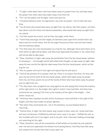 577. \the power from them who have taken away mine from me.8. \9. \thee.10. \face about unto the chaos and become powerless, who would take away my light from me utterly.11. \12. \down and turn to the chaos. And let thy angel Yew pursue them and cast them down into the darkness below.13. \from which its light will be taken; and they have oppressed the power in me, which they will not be able to take away.14. \its knowing it, -- the thought which Self-willed hath thought, to take away my light; take away his own and let the light be taken away from the lion-faced power, which set the trap for me.15. \16. \save me out of the hand of the lion-faced power, which hath taken away my power from me, and thou savest me out of the hands of them who have taken away my power and my light from me.17. \of the Light which is in the height, [the Light] in which I have had faith. And they have constrained me, [saying:] Tell unto us the mystery of the Light in the height, -- that which I know not.18. \height; and they have made my power lightless.19. \mourning.20. \wilt save me because I fulfilled thy will ever since I was in my %u00e6on. I fulfilled thy will, as the invisibles who are in my region, and as my pair. And I mourned, looking unceasingly and searching for the Light.21. \over me and sore oppressed me without my knowing [them]. And they have fled away and ceased from me but have had no pity upon me.