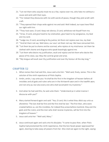 6021. \cause and wink with their eyes.22. \craft.23. \our sight with him.24. \25. \and my Lord.26. \27. \28. \clothed with shame and disgrace who speak boastingly against me.29. \peace of his slave, say: May the Lord be great and arise.30. \CHAPTER 521. When James then had said this, Jesus said unto him: \solution of the ninth repentance of Pistis Sophia. 2. Am%u0113n, am%u0113n, I say unto you: Ye shall be the first in the kingdom of heaven before all invisibles and all gods and rulers who are in the thirteenth %u00e6on and in the twelfth %u00e6on; and not only ye, but also every one who shall accomplish my mysteries.\3. And when he had said this, he said unto them: \discourse with you?\4. Mary started forward again and said: \aforetime: 'The last shall be first and the first shall be last.' The first then, who were created before us, are the invisibles, for indeed they arose before mankind, they and the gods and the rulers; and the men who shall receive mysteries, will be first into the kingdom of heaven.\5. Jesus said unto her: \6. Jesus continued again and said unto his disciples: \Sophia had proclaimed the ninth repentance, that the lion-faced power oppressed her again, desiring to take away all powers from her. She cried out again to the Light, saying: