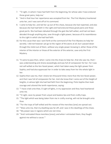 617. \these great pains, help me.'8. %unto her, and I was sent off at his command. 9. I came to help her, and led her up out of the chaos, because she had repented, and also because she had had faith in the Light and had endured these great pains and these great perils. She had been deluded through the god-like Self-willed, and had not been deluded through anything else, save through a light-power, because of its resemblance to the Light in which she had had faith. 10. For this cause then was I sent forth at the command of the First Mystery to help her secretly. I did not however yet go to the region of the %u00e6ons at all; but I passed down through the midst out of them, without any single power knowing it, either those of the interior of the interior or those of the exterior of the exterior, save only the First Mystery.11. \was understanding and shone exceedingly and was full of compassion for her. For I was not self-willed as the lion-faced power, which had taken away the light-power from Sophia, and had also oppressed her in order to take away from her the whole light in her. 12. Sophia then saw me, that I shone ten-thousand times more than the lion-faced power, and that I was full of compassion for her. And she knew that I came out of the Height of heights, in whose light she had had faith from the beginning. Pistis Sophia then took courage and uttered the tenth repentance, saying:13. %unto me.14. \15. \thee.16. \17. \18. \19. \against me without a cause.'\