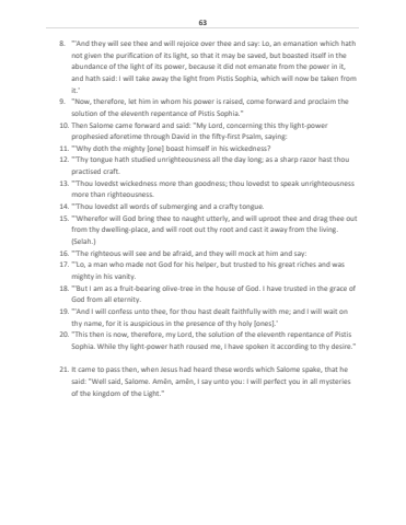 638. \not given the purification of its light, so that it may be saved, but boasted itself in the abundance of the light of its power, because it did not emanate from the power in it, and hath said: I will take away the light from Pistis Sophia, which will now be taken from it.'9. \solution of the eleventh repentance of Pistis Sophia.\10. Then Salome came forward and said: \prophesied aforetime through David in the fifty-first Psalm, saying:11. \12. \practised craft.13. \more than righteousness.14. \15. \from thy dwelling-place, and will root out thy root and cast it away from the living. (Selah.)16. \17. \mighty in his vanity.18. \God from all eternity.19. \thy name, for it is auspicious in the presence of thy holy [ones].'20. \Sophia. While thy light-power hath roused me, I have spoken it according to thy desire.\21. It came to pass then, when Jesus had heard these words which Salome spake, that he said: \of the kingdom of the Light.\