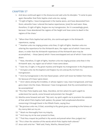 67CHAPTER 571. And Jesus continued again in the discourse and said unto his disciples: \again thereafter that Pistis Sophia cried unto me, saying:2. \them; wherefor have I uttered the twelve repentances, [one] for each %u00e6on. Now, therefore, O Light of lights, forgive me my transgression, for it is exceedingly great, because I have abandoned the regions of the height and have come to dwell in the regions of the chaos.'3. \repentance, saying:4. \ Hearken unto me singing praises unto thee, O Light of lights. Hearken unto me uttering the repentance for the thirteenth %u00e6on, the region out of which I have come down, in order that the thirteenth repentance of the thirteenth %u00e6on may be accomplished, -- those [%u00e6ons] which I have overstepped and out of which I have come down.5. \ Now, therefore, O Light of lights, hearken unto me singing praises unto thee in the thirteenth %u00e6on, my region out of which I have come down.6. \ Save me, O Light, in thy great mystery and forgive my transgression in thy forgiveness.7. \ And give unto me the baptism and forgive my sins and purify me from my transgression.8. \ And my transgression is the lion-faced power, which will never be hidden from thee; for because of it have I gone down.9. \ And I alone among the invisibles, in whose regions I was, have transgressed, and have gone down into the chaos. Moreover I have transgressed, that thy commandment may be accomplished.'10. %understand her words, come forward and proclaim her thought.\11. Martha came forward and said: \of that which Pistis Sophia hath spoken; thy power hath prophesied aforetime concerning it through David in the fiftieth Psalm, saying thus:12. \thy mercy blot out my sin.13. \14. \15. \16. \17. Jesus said unto her: \