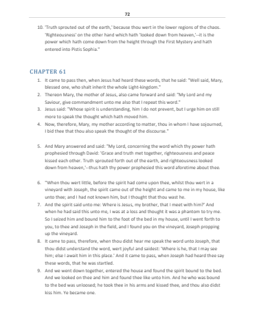 7210. 'Truth sprouted out of the earth,' because thou wert in the lower regions of the chaos. 'Righteousness' on the other hand which hath 'looked down from heaven,'--it is the power which hath come down from the height through the First Mystery and hath entered into Pistis Sophia.\CHAPTER 611. It came to pass then, when Jesus had heard these words, that he said: \blessed one, who shalt inherit the whole Light-kingdom.\2. Thereon Mary, the mother of Jesus, also came forward and said: \Saviour, give commandment unto me also that I repeat this word.\3. Jesus said: \more to speak the thought which hath moved him. 4. Now, therefore, Mary, my mother according to matter, thou in whom I have sojourned, I bid thee that thou also speak the thought of the discourse.\5. And Mary answered and said: \prophesied through David: 'Grace and truth met together, righteousness and peace kissed each other. Truth sprouted forth out of the earth, and righteousness looked down from heaven,'--thus hath thy power prophesied this word aforetime about thee.6. \vineyard with Joseph, the spirit came out of the height and came to me in my house, like unto thee; and I had not known him, but I thought that thou wast he. 7. And the spirit said unto me: Where is Jesus, my brother, that I meet with him?' And when he had said this unto me, I was at a loss and thought it was a phantom to try me. So I seized him and bound him to the foot of the bed in my house, until I went forth to you, to thee and Joseph in the field, and I found you on the vineyard, Joseph propping up the vineyard. 8. It came to pass, therefore, when thou didst hear me speak the word unto Joseph, that thou didst understand the word, wert joyful and saidest: 'Where is he, that I may see him; else I await him in this place.' And it came to pass, when Joseph had heard thee say these words, that he was startled.9. And we went down together, entered the house and found the spirit bound to the bed. And we looked on thee and him and found thee like unto him. And he who was bound to the bed was unloosed; he took thee in his arms and kissed thee, and thou also didst kiss him. Ye became one.