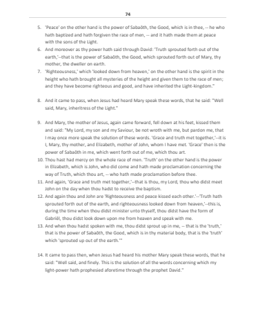 745. 'Peace' on the other hand is the power of Saba%u014dth, the Good, which is in thee, -- he who hath baptized and hath forgiven the race of men, -- and it hath made them at peace with the sons of the Light. 6. And moreover as thy power hath said through David: 'Truth sprouted forth out of the earth,'--that is the power of Saba%u014dth, the Good, which sprouted forth out of Mary, thy mother, the dweller on earth. 7. 'Righteousness,' which 'looked down from heaven,' on the other hand is the spirit in the height who hath brought all mysteries of the height and given them to the race of men; and they have become righteous and good, and have inherited the Light-kingdom.\8. And it came to pass, when Jesus had heard Mary speak these words, that he said: \said, Mary, inheritress of the Light.\9. And Mary, the mother of Jesus, again came forward, fell down at his feet, kissed them and said: \I may once more speak the solution of these words. 'Grace and truth met together,'--it is I, Mary, thy mother, and Elizabeth, mother of John, whom I have met. 'Grace' then is the power of Saba%u014dth in me, which went forth out of me, which thou art. 10. Thou hast had mercy on the whole race of men. 'Truth' on the other hand is the power in Elizabeth, which is John, who did come and hath made proclamation concerning the way of Truth, which thou art, -- who hath made proclamation before thee. 11. And again, 'Grace and truth met together,'--that is thou, my Lord, thou who didst meet John on the day when thou hadst to receive the baptism. 12. And again thou and John are 'Righteousness and peace kissed each other.'--'Truth hath sprouted forth out of the earth, and righteousness looked down from heaven,'--this is, during the time when thou didst minister unto thyself, thou didst have the form of Gabri%u0113l, thou didst look down upon me from heaven and speak with me. 13. And when thou hadst spoken with me, thou didst sprout up in me, -- that is the 'truth,' that is the power of Saba%u014dth, the Good, which is in thy material body, that is the 'truth' which 'sprouted up out of the earth.'\14. It came to pass then, when Jesus had heard his mother Mary speak these words, that he said: \light-power hath prophesied aforetime through the prophet David.\
