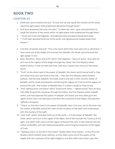 76BOOK TWOCHAPTER 631. JOHN also came forward and said: \which thy light-power hath prophesied aforetime through David.\2. And Jesus answered and said unto John: \speak the solution of the words which my light-power hath prophesied through David:3. \ Grace and truth met together, and righteousness and peace kissed each other.4. \ Truth hath sprouted forth out of the earth, and righteousness looked down from heaven.'\5. And John answered and said: \have come out of the Height and entered into Saba%u014dth, the Good, and embraced the light-power in him.' 6. Now, therefore, 'Grace and truth' which 'met together,'--thou art 'grace,' thou who art sent out of the regions of the Height through thy Father, the First Mystery which looketh within, in that he hath sent thee, that thou mayest have mercy on the whole world. 7. 'Truth' on the other hand is the power of Saba%u014dth, the Good, which bound itself in theeand which thou hast cast forth to the Left, -- thou the First Mystery which looketh without. And the little Saba%u014dth, the Good, took it and cast it forth into the matter of Barb%u0113l%u014d, and he made proclamation concerning the regions of Truth to all the regions of those of the Left. That matter of Barb%u0113l%u014d then it is which is body for thee to-day.8. \who didst bring all the mysteries through thy Father, the First Mystery which looketh within, and hast baptized this power of Saba%u014dth, the Good; and thou didst go to the region of the rulers and didst give unto them the mysteries of the Height; they became righteous and good.9. \the matter of Barb%u0113l%u014d, and all the rulers of the six %u00e6ons of Yabra%u014dth have made peace with the mystery of the Light.10. \Good, which came out of the region of the Right, which lieth outside the Treasury of the Light, and which hath come into the region of those of the Left; it hath entered into the matter of Barb%u0113l%u014d, and hath made proclamation concerning the mysteries of the region of Truth.11. \Mystery which looketh down without, as thou didst come out of the spaces of the Height with the mysteries of the Light-kingdom; and thou didst come down upon the