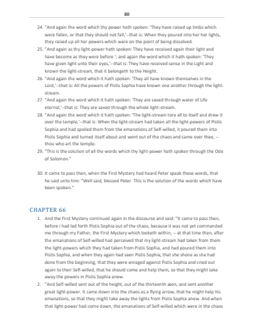 8024. \were fallen, or that they should not fall,'--that is: When they poured into her her lights, they raised up all her powers which were on the point of being dissolved.25. \have become as they were before '; and again the word which it hath spoken: 'They have given light unto their eyes,'--that is: They have received sense in the Light and known the light-stream, that it belongeth to the Height.26. \Lord,'--that is: All the powers of Pistis Sophia have known one another through the lightstream.27. \eternal,'--that is: They are saved through the whole light-stream.28. \over the temple,'--that is: When the light-stream had taken all the light-powers of Pistis Sophia and had spoiled them from the emanations of Self-willed, it poured them into Pistis Sophia and turned itself about and went out of the chaos and came over thee, --thou who art the temple.29. \of Solomon.\30. It came to pass then, when the First Mystery had heard Peter speak these words, that he said unto him: \been spoken.\CHAPTER 661. And the First Mystery continued again in the discourse and said: \before I had led forth Pistis Sophia out of the chaos, because it was not yet commanded me through my Father, the First Mystery which looketh within, -- at that time then, after the emanations of Self-willed had perceived that my light-stream had taken from them the light-powers which they had taken from Pistis Sophia, and had poured them into Pistis Sophia, and when they again had seen Pistis Sophia, that she shone as she had done from the beginning, that they were enraged against Pistis Sophia and cried out again to their Self-willed, that he should come and help them, so that they might take away the powers in Pistis Sophia anew.2. \great light-power. It came down into the chaos as a flying arrow, that he might help his emanations, so that they might take away the lights from Pistis Sophia anew. And when that light-power had come down, the emanations of Self-willed which were in the chaos