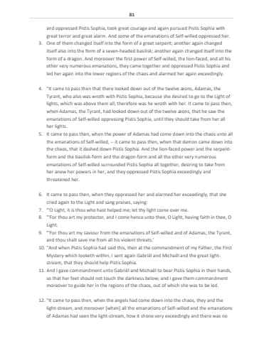 81and oppressed Pistis Sophia, took great courage and again pursued Pistis Sophia with great terror and great alarm. And some of the emanations of Self-willed oppressed her. 3. One of them changed itself into the form of a great serpent; another again changed itself also into the form of a seven-headed basilisk; another again changed itself into the form of a dragon. And moreover the first power of Self-willed, the lion-faced, and all his other very numerous emanations, they came together and oppressed Pistis Sophia and led her again into the lower regions of the chaos and alarmed her again exceedingly.4. \Tyrant, who also was wroth with Pistis Sophia, because she desired to go to the Light of lights, which was above them all; therefore was he wroth with her. It came to pass then, when Adamas, the Tyrant, had looked down out of the twelve %u00e6ons, that he saw the emanations of Self-willed oppressing Pistis Sophia, until they should take from her all her lights. 5. It came to pass then, when the power of Adamas had come down into the chaos unto all the emanations of Self-willed, -- it came to pass then, when that demon came down into the chaos, that it dashed down Pistis Sophia. And the lion-faced power and the serpentform and the basilisk-form and the dragon-form and all the other very numerous emanations of Self-willed surrounded Pistis Sophia all together, desiring to take from her anew her powers in her, and they oppressed Pistis Sophia exceedingly and threatened her. 6. It came to pass then, when they oppressed her and alarmed her exceedingly, that she cried again to the Light and sang praises, saying:7. \8. \Light.9. \and thou shalt save me from all his violent threats.'10. \Mystery which looketh within, I sent again Gabri%u0113l and Micha%u0113l and the great lightstream, that they should help Pistis Sophia. 11. And I gave commandment unto Gabri%u0113l and Micha%u0113l to bear Pistis Sophia in their hands, so that her feet should not touch the darkness below; and I gave them commandment moreover to guide her in the regions of the chaos, out of which she was to be led.12. \light-stream, and moreover [when] all the emanations of Self-willed and the emanations of Adamas had seen the light-stream, how it shone very exceedingly and there was no