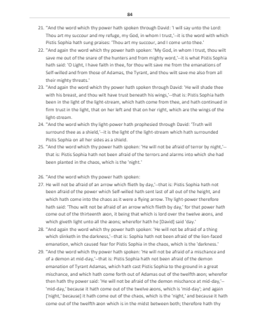 8421. \Thou art my succour and my refuge, my God, in whom I trust,'--it is the word with which Pistis Sophia hath sung praises: 'Thou art my succour, and I come unto thee.'22. \save me out of the snare of the hunters and from mighty word,'--it is what Pistis Sophia hath said: 'O Light, I have faith in thee, for thou wilt save me from the emanations of Self-willed and from those of Adamas, the Tyrant, and thou wilt save me also from all their mighty threats.'23. \with his breast, and thou wilt have trust beneath his wings,'--that is: Pistis Sophia hath been in the light of the light-stream, which hath come from thee, and hath continued in firm trust in the light, that on her left and that on her right, which are the wings of the light-stream.24. \surround thee as a shield,'--it is the light of the light-stream which hath surrounded Pistis Sophia on all her sides as a shield.25. \that is: Pistis Sophia hath not been afraid of the terrors and alarms into which she had been planted in the chaos, which is the 'night.'26. \27. He will not be afraid of an arrow which flieth by day,'--that is: Pistis Sophia hath not been afraid of the power which Self-willed hath sent last of all out of the height, and which hath come into the chaos as it were a flying arrow. Thy light-power therefore hath said: 'Thou wilt not be afraid of an arrow which flieth by day,' for that power hath come out of the thirteenth %u00e6on, it being that which is lord over the twelve %u00e6ons, and which giveth light unto all the %u00e6ons; wherefor hath he [David] said 'day.'28. \which slinketh in the darkness,'--that is: Sophia hath not been afraid of the lion-faced emanation, which caused fear for Pistis Sophia in the chaos, which is the 'darkness.'29. \of a demon at mid-day,'--that is: Pistis Sophia hath not been afraid of the demon emanation of Tyrant Adamas, which hath cast Pistis Sophia to the ground in a great mischance, and which hath come forth out of Adamas out of the twelfth %u00e6on; wherefor then hath thy power said: 'He will not be afraid of the demon mischance at mid-day,'--'mid-day,' because it hath come out of the twelve %u00e6ons, which is 'mid-day'; and again ['night,' because] it hath come out of the chaos, which is the 'night,' and because it hath come out of the twelfth %u00e6on which is in the midst between both; therefore hath thy
